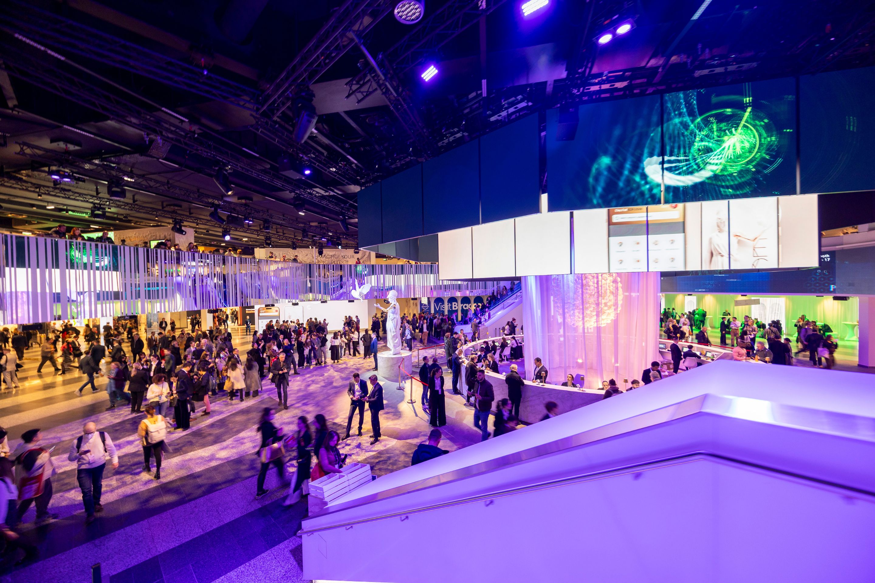 Die Architektur des Austria Center Vienna mit ihren 5 miteinander verbundenen Ebenen, flexiblen und technisch optimal ausgestatteten Sälen und Räumen sowie den Hallen bildete die Grundlage für diese Inszenierung und ermöglichte eine immersive Besucher:innen-Journey durch den gesamten Kongress. So entstanden fließende Themenbereiche, in denen Ausstellungsflächen, Networking-Zonen und die Vermittlung wissenschaftlicher Inhalte ineinander übergingen und eine zusammenhängende Erlebnislandschaft bildeten.