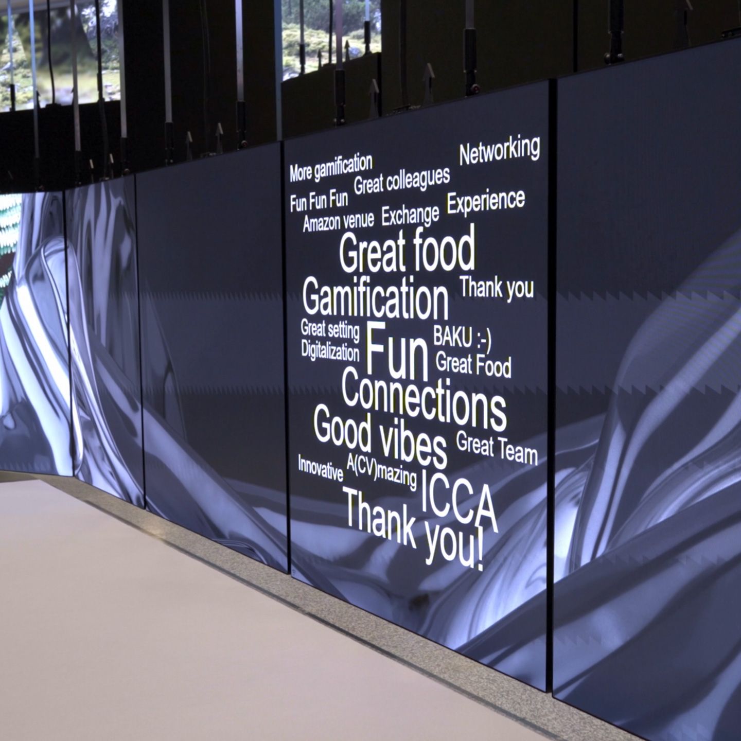 Die polySTAGE ist die weltweit größte fix installierte kinetische LED-Installation mit über 310 m² LED-Flächen und 52 beweglichen Paneelen. Sie verwandelt die Eingangshalle des Austria Center Vienna in eine immersive Erlebniswelt für Events.