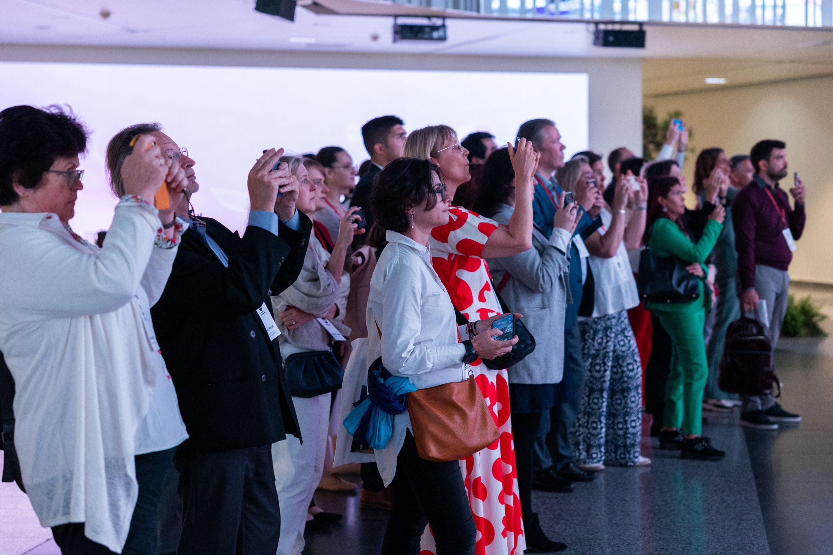 The polySTAGE in the entrance hall welcomed participants with a personal greeting after their badges were scanned. A video message with AI-generated translation from HeyGen helped get guests in the mood for the innovative workshop ahead. After the countdown, the polySTAGE showcase began, with the movable LED panels morphing into different settings: from art gallery to digital exhibition stand.